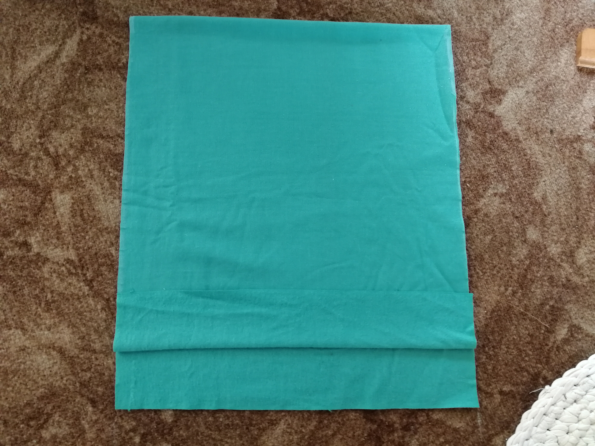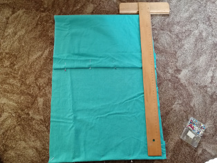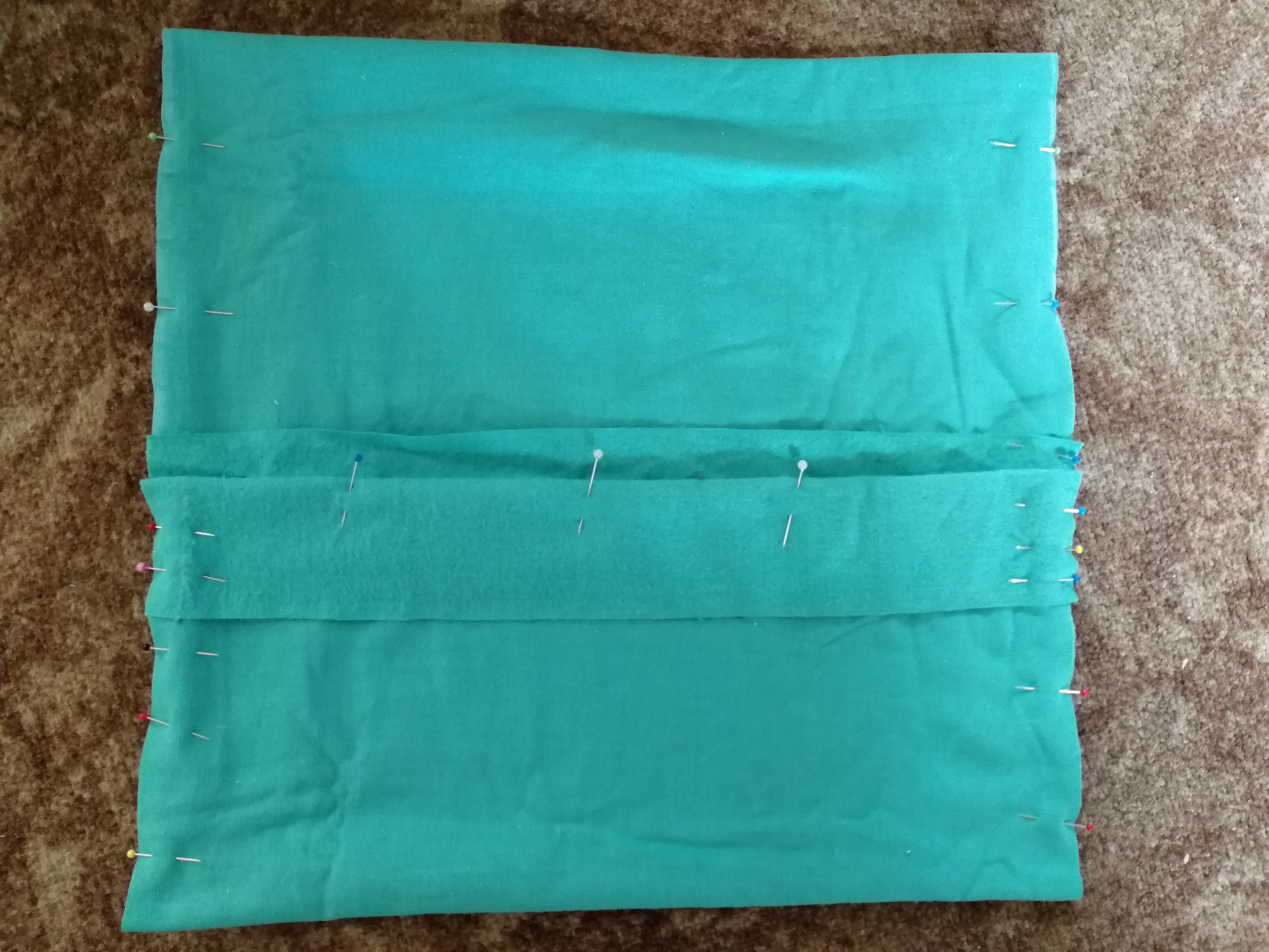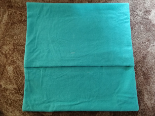 Vystrihneme si z látky obdĺžnik s rozmermi 38 cm x 90 cm. Prehneme na polovicu podľa osi dlhšej strany. Potom si pomocou špendlíkov vyhneme 5 cm nahor. Toto bude predstavovať okraj otvoru na navliekanie na vankúš. Posunieme prehnutú časť hore tak, aby sme získali obdĺžnik 38 cm x 75 cm. Priložíme zo spodu a prehneme látku ku už prehnutej látke. Všetko preželhlíme, aby sme mali istotu, že sú látky k sebe presne priložené. Pri žehlení dávame pozor, aby sme neprešli špendlíky. Všetko prešpendlíme.