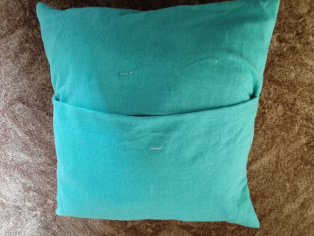 Zošijeme po oboch stranách. Ak máme, je vhodné použiť overlok alebo na bežno stroji endlovačku a rovný steh. Potom obliečku vyvrátime a navlečieme na vankúš. My sme si uvedomili, že sme vankúš mali veľmi tuho naplnený a teda objemnejší, preto sme ešte trochu museli prišiť drobným stehom prehnuté časti, aby sa nám veľmi neposúvali. V prípade, že nemáte vankúš tak naplnený, nie je to potrebné.