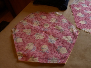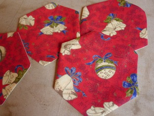 A nakoniec ešte urobíme 2 a 2 šesťuholníky zložené z rovnostranných trojuholníkov s dĺžkou strany 28 cm, z ktorých ušijeme prestieranie na žemle alebo rožky či buchty.
