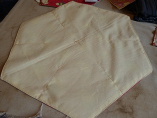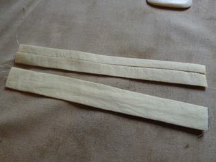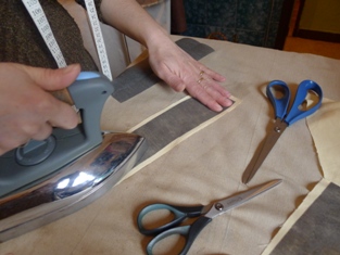 Kúpili sme dva druhy látky šírky 140 cm dlhej 1,5 m. Obidve sme najprv doma poskladané vyprali pri 40°C. Po vyschnutí namočili do tekutého škrobu a zase po vyschnutí dobre prežehlili naparovacou žehličkou. Takto sa nám bude lepšie vymeriavať aj strihať - nebude sa látka tak párať - a pri vyvracaní látky bude lepšie držať tvar pred žehlením.