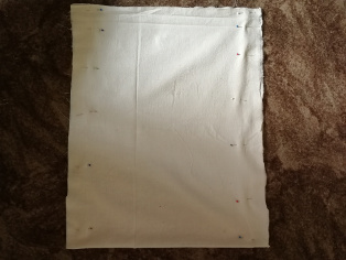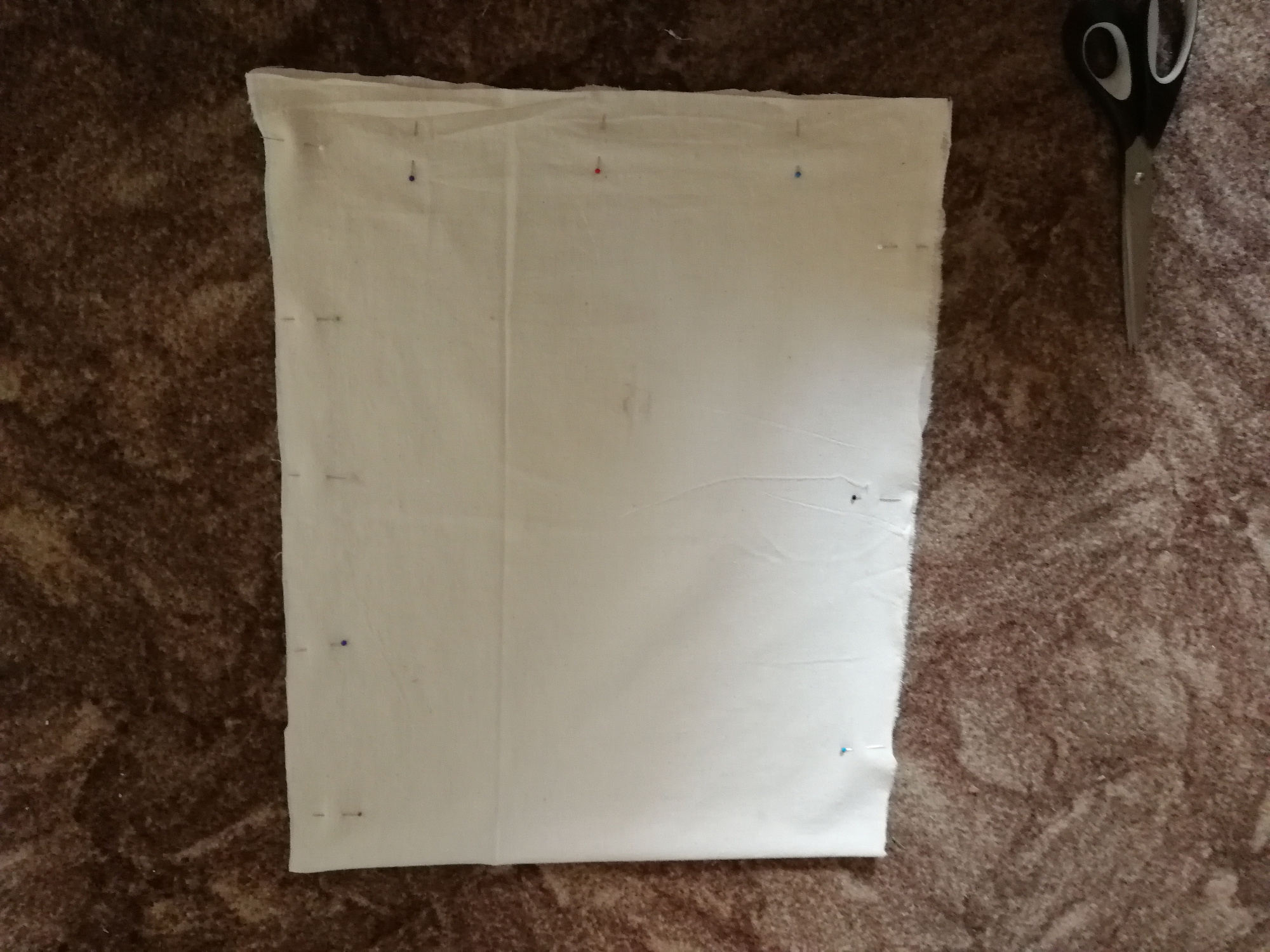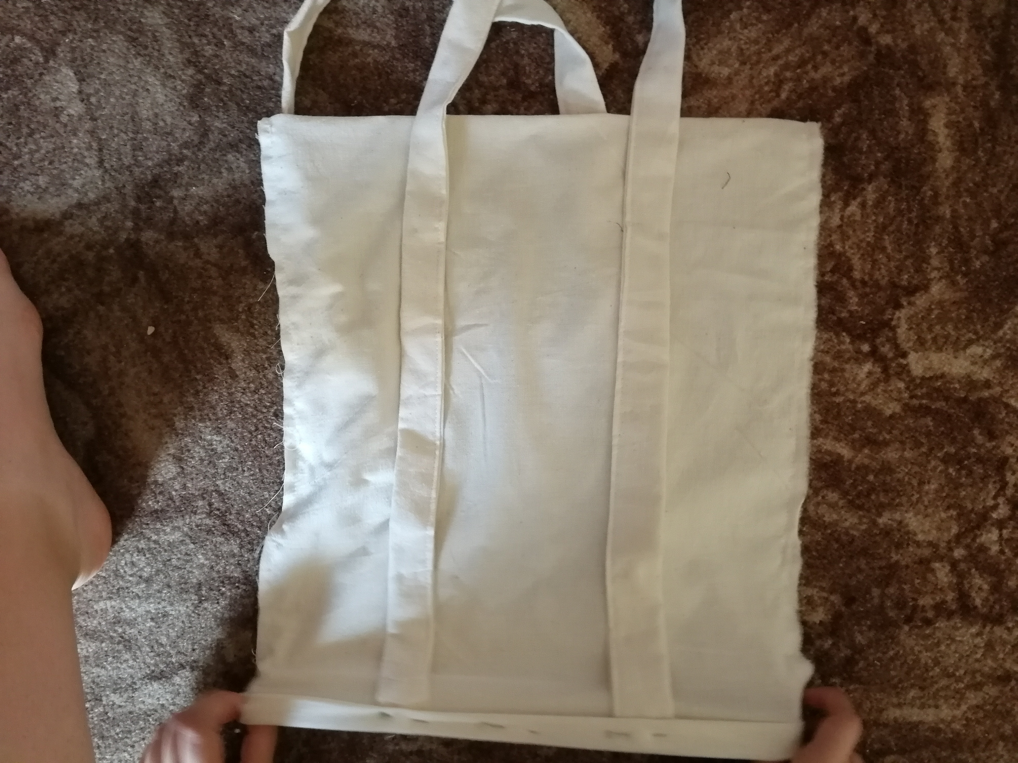 Vystrihneme si obdĺžnik s rozmermi 36 cm a 90 cm a prehneme ho podľa osi dlhšej strany. Najprv si prehneme a zažehlíme budúci otvor na taške. Znova zažehlené rozložíme. Prešijeme po bokoch tak, aby sme vytvorili vrecko.