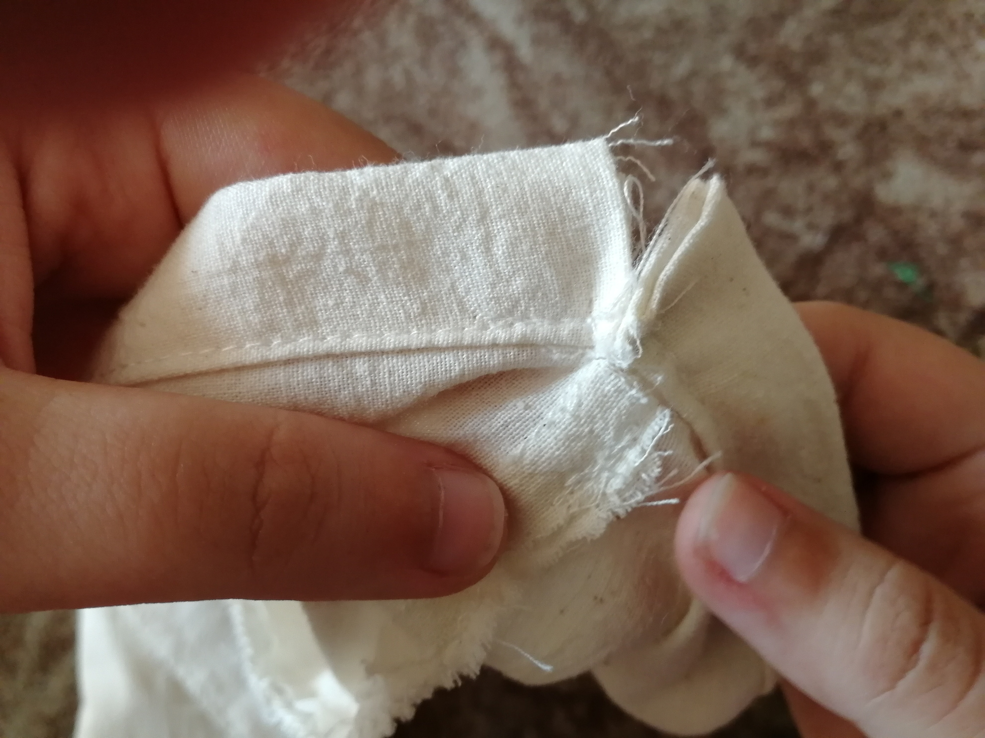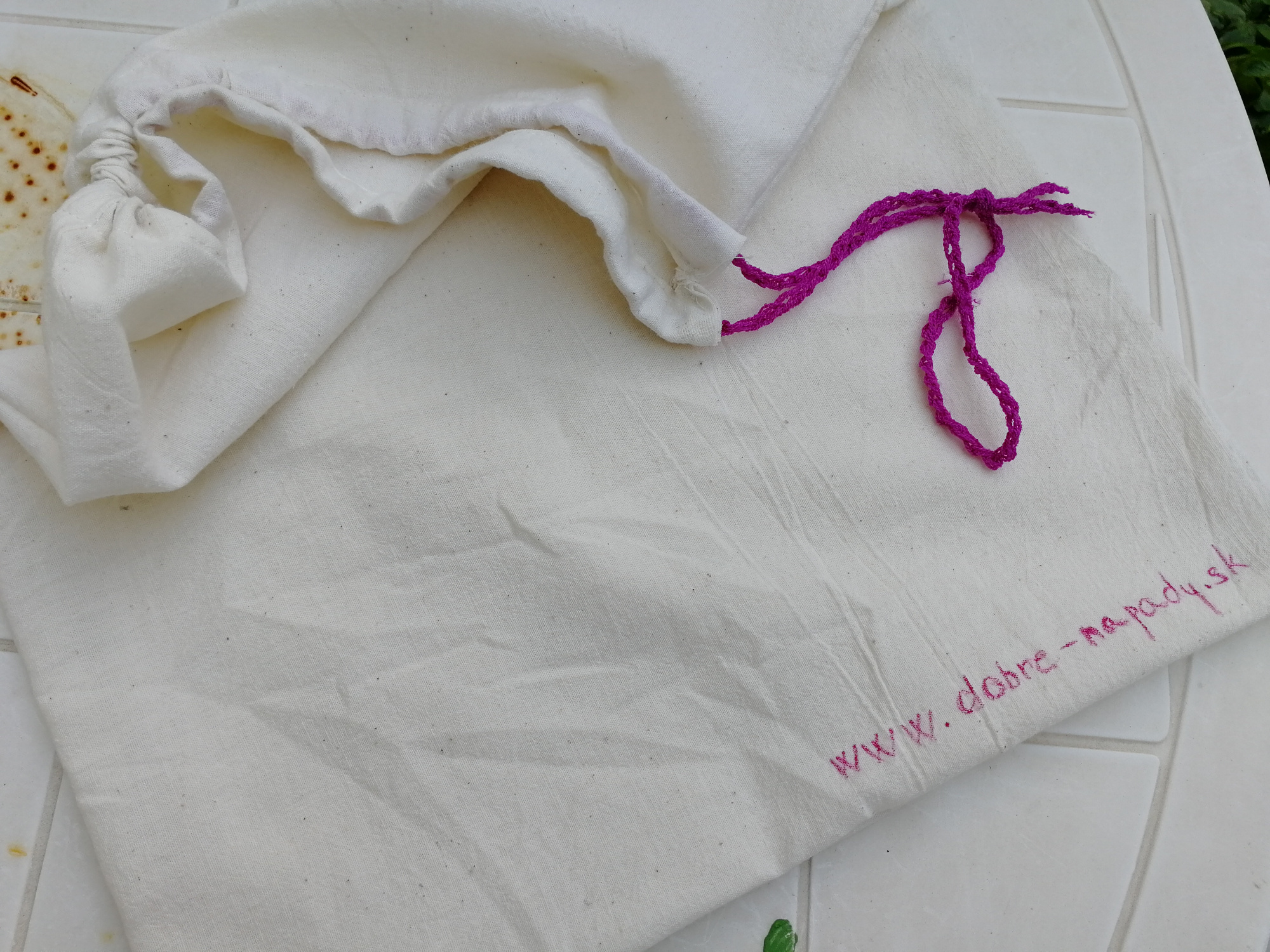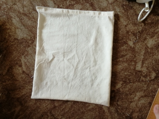 Na tretej strane si naznačíme kriedou čiaru, podľa ktorej zošijeme látku do vrecka. Prešijeme zároveň aj dvomi stehmi spodnú časť tunela. Môžeme to vidieť na druhej fotografii. Tým vrecko uzavrieme a dokončíme.