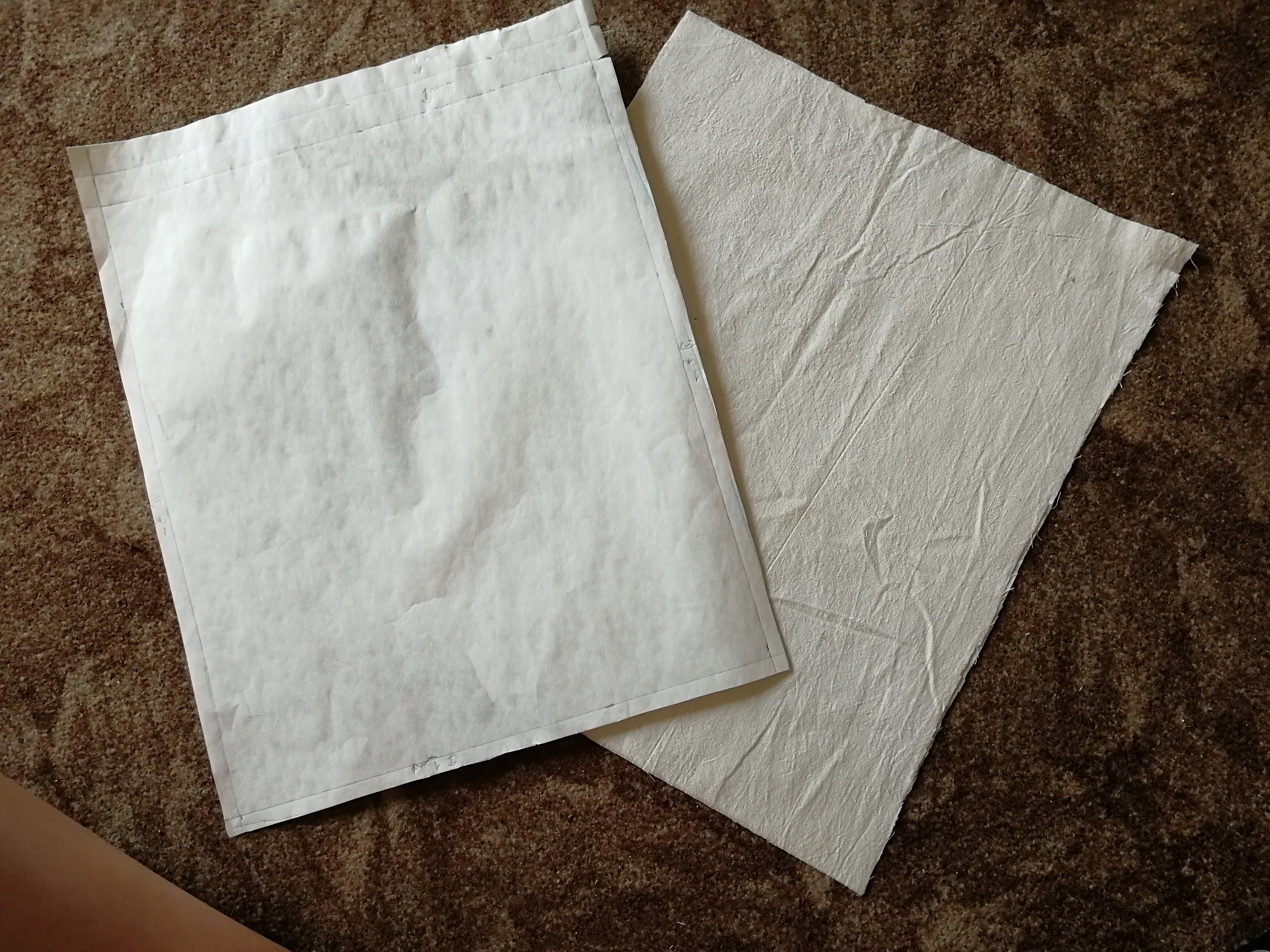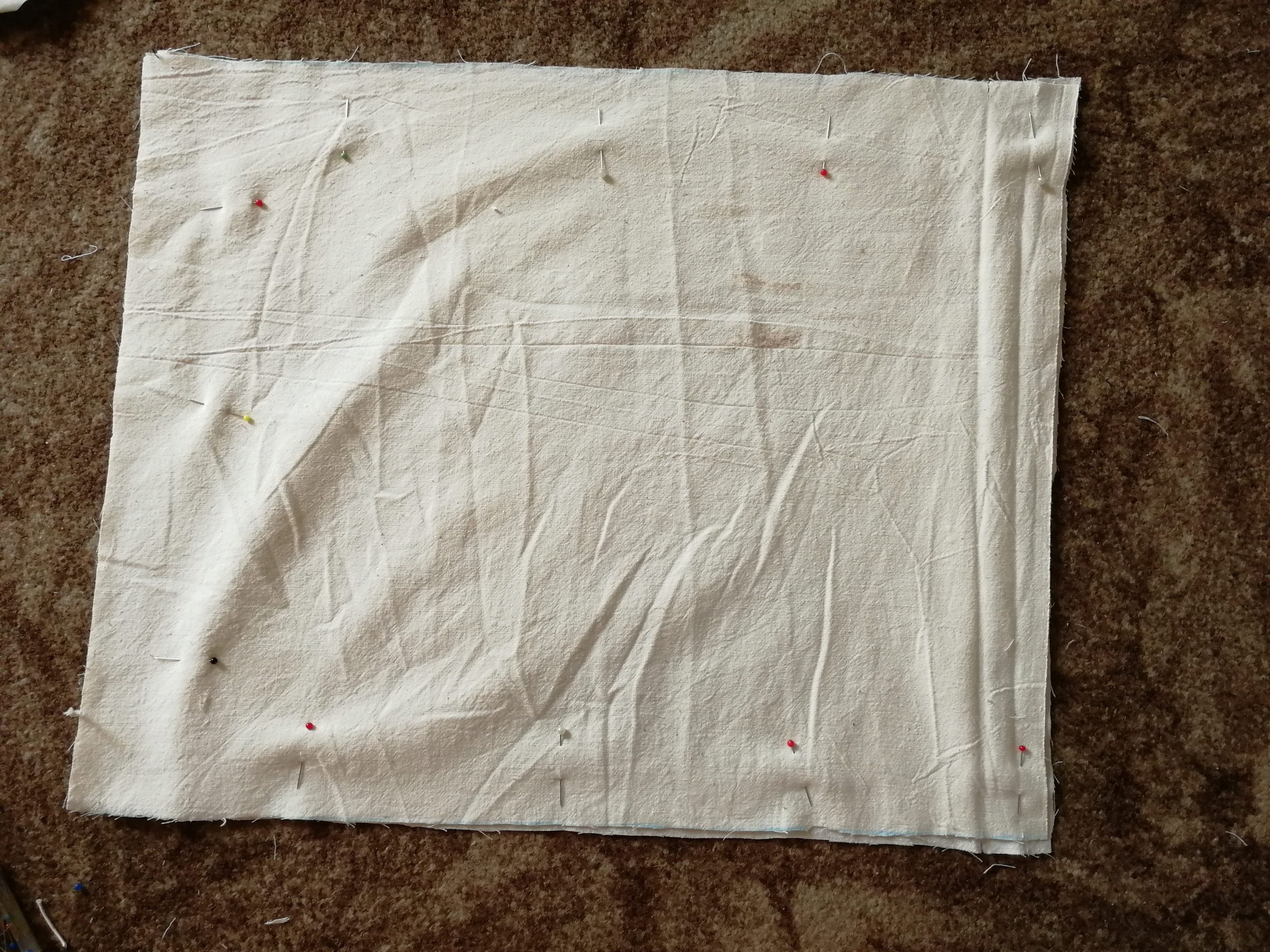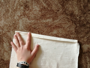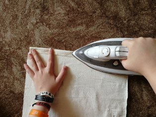 Prehneme si na oboch dieloch látky vrchnú časť do tvaru tunela a zažehlíme. Znova vystrieme. Látku zošpendlíme a následne prešijeme v tvare L pol centimetra od okraja. Prešijeme - pozrite sa na druhú fotografiu - spodnú a ľavú stranu.