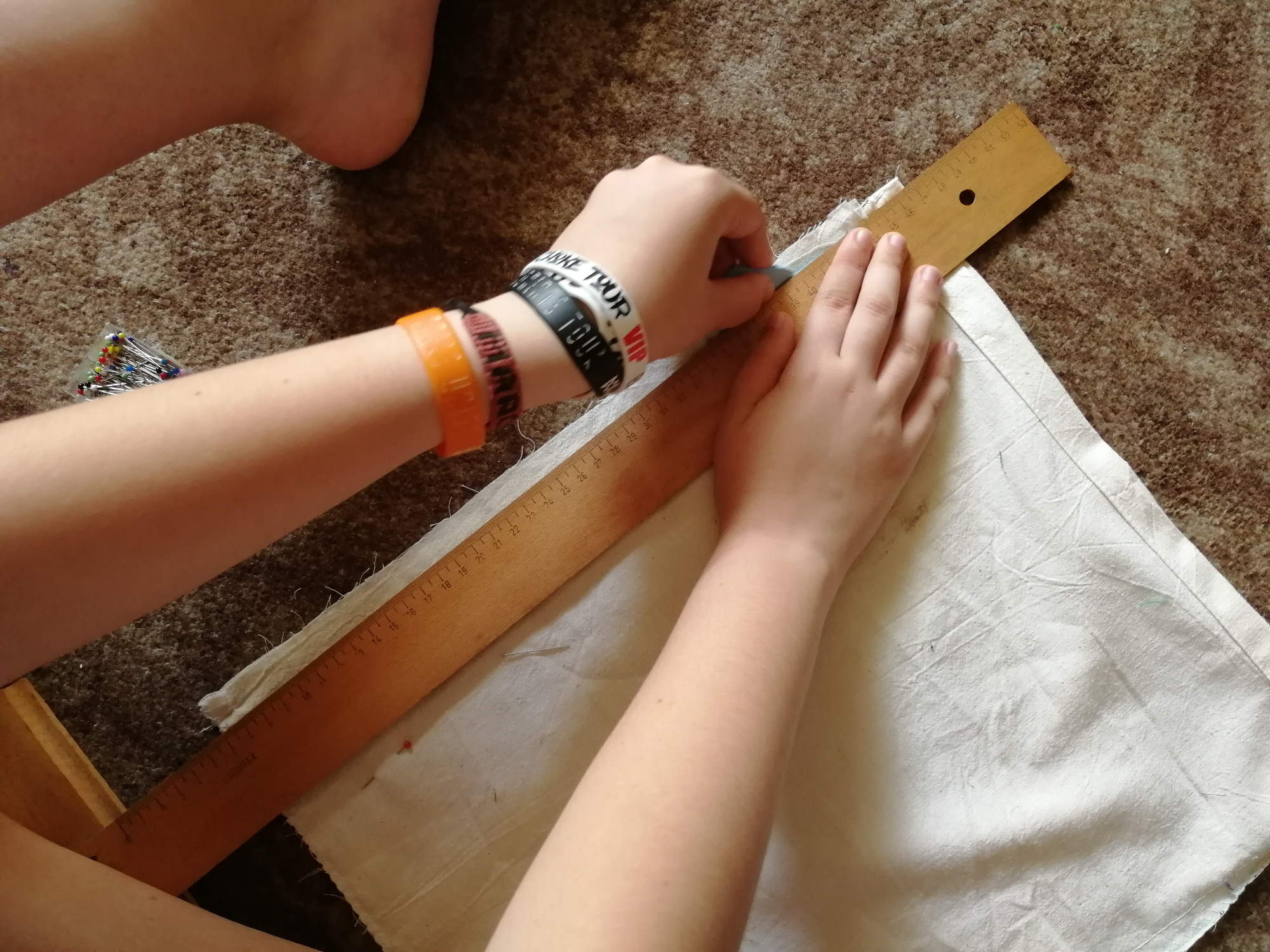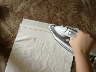 Po zašití v tvare L, znova prehneme látku podľa naznačených čiar, ktoré sme si urobili pri prvom žehlení. Znova prežehlíme a zároveň si dáme pozor, aby sme si upravili prehnutie spolu so zašitím. Prešpendlíme a prešijeme, čím si vytvoríme tunel na šnúrku.