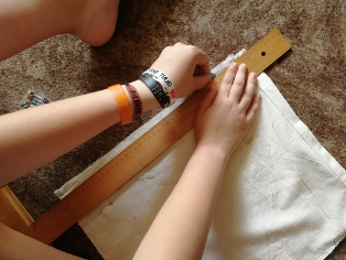 Najprv si urobíme strih na papier. Vymeriame si rozmery ako môžete vidieť na zväčšenine fotografie. Strih si potom obkreslíme na látku. Na strihu máme nakreslené aj dve vodorovné čiary, ktoré naznačujú tunel na navlečenie šnúrky. Na strihu aj na látke si tieto miesta nastrihneme, aby sme si naznačili, kde budeme látku prehýbať na otvor na šnúrku.