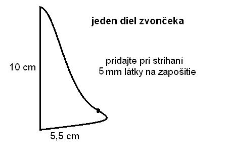 Vystrihneme si z každého druhu látky po 6 kusov dielov zvončeka, pričom ku šablóne pridáme 5 mm na zapošitie. Zošívame vždy dva diely tak, že jeden je z jednej látky a druhý z druhej látky. Zošijeme ich tak, aby v strede nám zostal asi 2 cm široký otvor. Cez tento otvor látku vyvrátime a napravíme do správneho tvaru a aj naplníme vatelínom. Potom otvor ručne zošijeme. Nakoniec dostaneme 6 dielov, ktoré zošijeme hore spolu so zlatou mašľou a šnúrkou na zavesenie. Diely zošijeme dole a aby sme zakryli zošitie, prišijeme tam rolničku. Zvonček aj krásne zvoní.