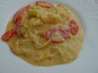 Jednu veľkú cibuľu nakrájame na polkrúžky a na polievkovej lyžici bravčovej masti speníme. Pridáme na polkrúžky nakrájané tri papriky a premiešame. Mierne osolíme a pod pokrievkou podusíme chvíľu. Pridáme na polkolieska nakrájané dve paradajky. Premiešame. Za stáleho miešania vlejeme rozmixovaných vidličkou šesť vajíčok. Miešame na strednom plameni do zhustnutia.
