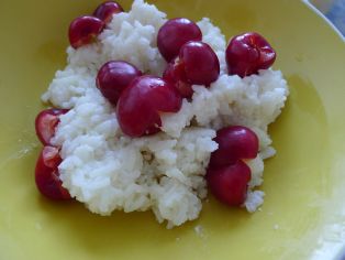 100 ml ryže prebrieme a v sypeme do 300 ml vriaceho mlieka na miernom plameni. Miešame. Vmiešame aj štipku soli. Necháme za stáleho miešania prejsť varom asi 5 minút. Potom prkryjeme pokrievkou a odstavíme na 15 - 20 minút. Vmiešame čajovú lyžičku masla a polievkovú lyžicu medu. Položíme na tanier, kde posypeme odkvostnovanými čerešňami.