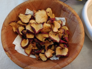 Jabĺčka rozštvrtíme a vyberieme jaderník. Nakrájame ich na hrúbku asi 3 mm. Na také mesiačiky. Poukladáme ich na papier na pečenie, ktorý rozprestrieme na teplý radiátor. Každého pol dňa ich pootáčame. A opakujeme, kým nie sú jabĺčka suché. Ak už nestihnete čakať niekoľko dní, môžete ich vložiť do vyhriatej rúry na 50°C a usušiť takto. Nezabudnite ich otočiť.