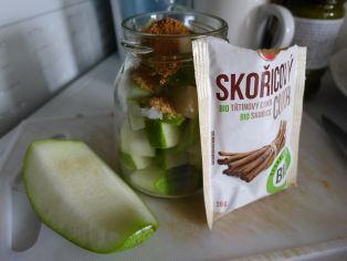 Ak si takto chceme urobiť jablko, potom na dno pohárika vložíme kúsok pomaranča, nasypeme kúsky jablka s 1 klinčekom a 1 čajovou lyžičkou hnedého cukru. Sparíme 30 minút.
