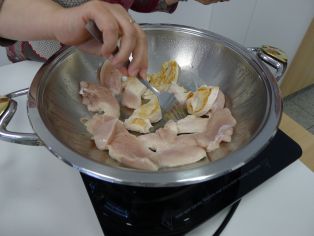 Nakrájame si morčacie prsia na menšie kúsky alebo použijeme vykostené kuracie stehná. Mäso mierne osolíme a okoreníme bielym korením. Vložíme do sklenenej misy a vyvákuujeme na asi pol hodiny. Tým dosiahneme, že sa korenie lepšie vstrebe do mäsa.