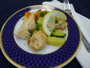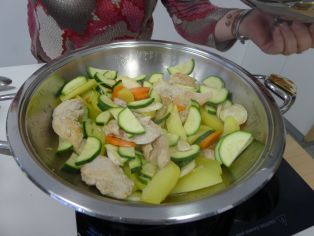 Rozpálime si vok. Mäso tak na sucho poukladáme do neho. Prikryjeme na asi 2 - 3 minúty. Potom mäso otočíme a zase necháme 2 - 3 minúty opiecť. Za tento čas mäso pustí šťavu. Vsypeme nakrájanú zeleninu - mrkvu, cukinu, červenú cibuľu a podobne. Premiešame a prikryjeme pokrievkou. Necháme piecť asi 5 minút. Odkryjeme a premiešame. Pri kuracom mäse už by malo byť všetko teraz hotové, morčacie nechajte piecť dlhšie.