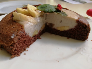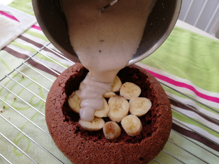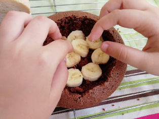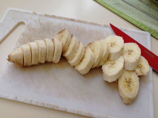 Banán nakrájame na hrubšie kolieska a poukladáme ich na dno vydlabanej časti tortového korpusu.