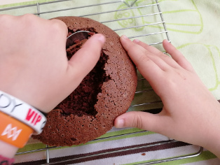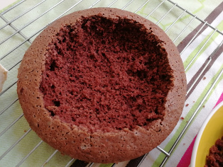 Upečený korpus necháme dobre vychladnúť vo forme. potom ho vyklopíme na mriežku a začneme dlabať. Urobíme dieru tak, aby sme nechali okraj šírky asi 1 cm, prípadne trochu viac. Dlabeme asi do polovice výšky korpusu.