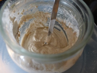 Prisypeme do pohára zase 1 polievkovú lyžicu múky a 2 polievkové lyžice vody. Premiešame a necháme zase stáť do druhého dňa na rovnakom mieste.