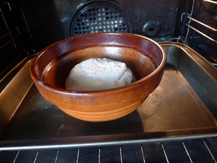 Kvetináčik si vytrieme kúskom slaniny. Do neho vložíme urobenú guľu a necháme vo vyhriatej rúre na 70°C kysnúť asi pol hodiny. Potom zvýšime teplotu v rúre na 200°C bez toho, aby sme vybrali chlebík z rúry. Necháme piecť asi 45 - 50 minút.