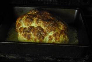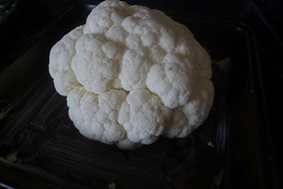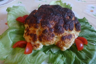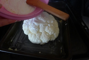 Hlavu karfiolu umyjeme a očistíme od drevnatých častí alebo lístkov. Položíme na maslom vytretý pekáčik. Ponatierame ho v jogurte rozmiešaným vajíčkom, ktoré sme osolili a okorenili. Necháme postáť asi pol hodiny a znovu ponatierame. Vložíme do vyhriatej rúry na 180°C na asi 40 - 45 minút.