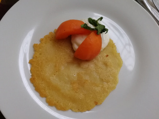 Na prvej fotografii sme na ozdobu použili vymiešaný tučný biely jogurt s medom v pomere 4 polievkové lyžice jogurtu ku 1 čajovej lyžičke medu. Pridali sme marhuľu a medovku.