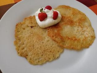 Zvyčajne robíme tieto palacinky z polovice zmesi, štipky sódy a asi 210 ml vody. Bežne len natieme lekvár. Alebo potrieme lekvárom rozmixovaným s jogurtom.