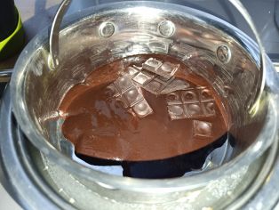 Čokoládu spolu s maslom necháme rozpustiť nad parou. Premiešame, aby bola zmes hladká. Pridáme cukor a šľahačku. Premiešame nad parou do hladkej hmoty, ktorou ešte teplou polejeme či potrieme tortu.