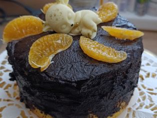 Po vytiahnutí z rúry necháme vychladnúť. Vyklopíme a nakrájame na tri časti. Potrieme pomarančovou marmeládou, poskladáme späť a polejeme polevou z horkej čokolády.