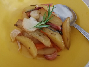 300 g nových zemiakov pokrájame. V miske ich premiešame so 100 g na polkolieska nakrájanou cibuľou, 100 g naštvrtenými červenými redkvičkami a 100 g nakrájanej mrkvy na prúžky. Pridáme asi polovicu lyžičky soli, lyžičku rozmarínu. Premiešame. Vysypeme na pekáč vytretý maslom. Pokryjeme prúžkami masla. Vložíme do rúry vyhriatej na 200°C a pečieme asi 30 minút. Občas premiešame počas pečenia.