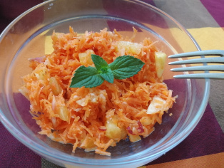 4 mrkvy nastrúhame na jemno a premiešame jaablko nastrúhané na hrubo spolu s asi desiatimi kúskami čerstvého ananásu. Ak je šalát veľmi hustý, môžeme pridať lyžicu-dve jablkovej šťavy. Dozdobíme medovkou alebo mätou.