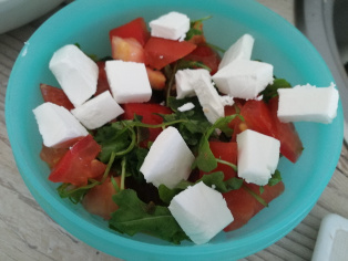 2 veľké paradajky nakrájame a premiešame s trochou soli. Pridáme asi desať natrhaných lístkov rukoly. A nakoniec posypeme 50-timi gramami čerstvého slaného syra.