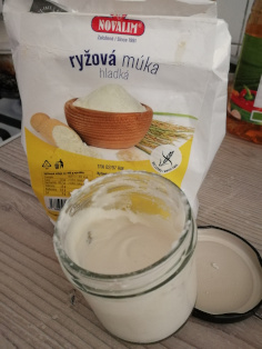 Do skleneného pohára nasypeme 2 polievkové lyžice ryžovej múky, 2 polievkové lyžice vody a dobre premiešame. Prikryjeme viečkom a necháme na pracovnej doske odpočívať 12 hodín. Potom zopakujeme.