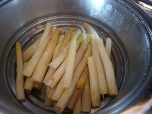 Do hrnca nalejeme osolenú vodu, položíme dierovanú nádobu, do ktorej položíme špargľu. Dierovanú nádobu prikryjeme pokrievkou. Necháme vodu a hrnce zohriať. potom stiahneme teplotu na minimum a takto sparíme špargľu asi 15 minút. Potom vypneme plyn a necháme dôjsť ešte asi 10 minút.