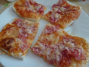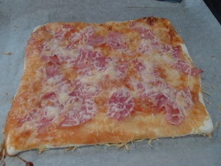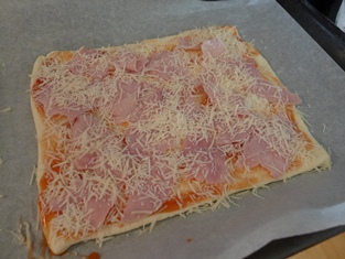 200 ml vody premiešame s 1 čajovou lyžičkou oleja a polovicou čerstvého droždia. Necháme podkysnúť na teplom mieste. Primiešame po lyžiciach asi 200 g zmesi so štipkou soli. Vypracujeme cesto. Vyvaľkáme asi na 5 mm. Položíme na pekáč vystlaný papierom na pečenie. Potrieme kečupom. posypeme nastrúhaným syrom a potrhanou šunkou. Necháme asi 20 minúť podkysnúť. Potom vložíme do rúry vyhriatej na 200°C a pečieme asi 20 - 25 minút.