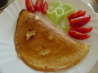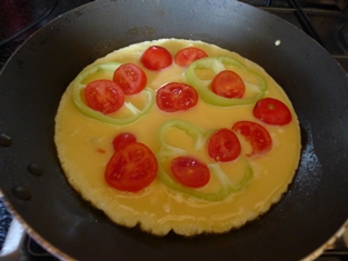 Na panvici si rozohrejeme olej - len trošku. Vylejeme cesto na panvicu, osolíme a posypeme ho paradajkami a paprikou a pečieme na strednom plameni prikryté asi 2 minúty. Omeletu preložíme na tanier. Podávame teplé. Ako prílohu môžeme urobiť varené zemiaky a podávať aj ako hlavné jedlo.