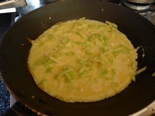 1 veľké vajíčko vymiešame s 50 ml vody. Pridáme 2 mierne kopcovité polievkové lyžice zmesi. Dobre vymiešame. (Zvyčajne stačí vymiešať vo vysokej šálke vidličkou, ale občas sa mi to hrudkovatie a tak vlejem do nádoby a radšej rozmiešam ručným mixérom.) Nakoniec vmiešame štipku sódy bikarbóny a soli. Necháme chvíľu postáť.