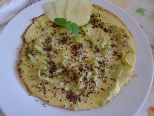 Na panvici si rozohrejeme olej - len trošku. Vylejeme cesto a pečieme na strednom plameni. Povrch posypeme nastrúhaným jablkom na hrubo - asi tak 3 polievkové lyžice. Ak môžeme, nie ste alergický, posypeme povrch škoricou. Panvicu na asi 2 minúty prikryjeme. Potom preložíme na tanier. Podávame teplé.