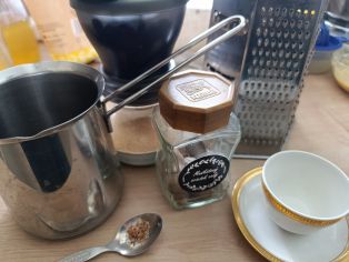 2 čajové lyžičky na hrubo zomletej kávy spolu s 2 klinčekmi a kúskom škorice zalejeme 175 ml studenej vody. Necháme pôsobiť asi 2 - 3 hodiny. Potom privedieme do varu až kým nestúpa pena. Odložíme z plameňa, počkáme, kým neklesne pena, následne vrátime na plameň a zase privedieme do varu až kým nestúpa znova pena. Po druhom stúpaní peny prelejeme cez sitko do pohárikov. Ak potrebujeme dosladiť, použijeme med.