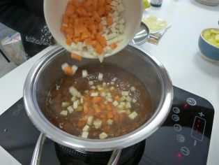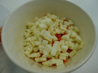 Nakrájame si na menšie kúsky koreňovú zeleninu, prípadne menšiu cibuľu a 2 - 3 strúčiky cesnaku.