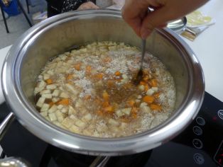 Po skončení varenia odstavíme hrniec z plameňa a necháme červený gombík prirodzene klesnúť - čo môže trvať asi 10 minút. Potom pokrievku otvoríme a do fazule vsypeme zeleninu a rozmixovanú fazuľu. Premiešame. Prikryjeme už obyčajnou pokrievkou a varíme ešte asi 10 - 12 minút.