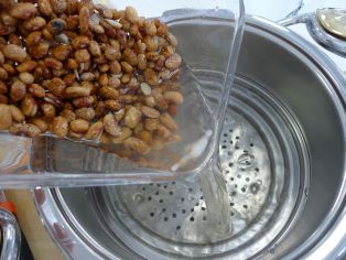 Zlejeme fazuľu z vody. Vsypeme do hrnca a zalejeme čerstvou vodou. Prikryjeme tlakovou pokrievkou a varíme pod tlakom 5 - 7 minuút podľa toho ako stará bola fazuľa.