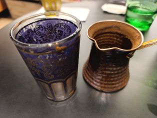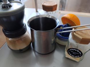1 čajová lyžička arabskej kávy, 1 čajová lyžička nastrúhanej pomarančovej kôry - lepšie sušenej, 1/2 čajovej lyžičky trstinového cukru, 1 polievková lyžica čerstvej pomarančovej šťavy