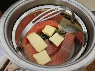 V drobnej miske si premiešame soľ a cukor v pomere 2 : 1. Vo veľkom hrnci si necháme zovrieť vodu. Do menšieho hrnca či misky si nakrájame plátky masla, na ktoré položíme lososa. Okoreníme zmesou soli, ale veľmi opatrne. Preložíme petržlenovou vňaťou alebo rozmarínom. Misku vložíme do vriacej vody, prikryjeme pokrievkou a necháme asi 20 minút variť.