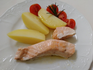 Opatrne vyberieme lososa na tanier. Pridáme varené zemiaky a prelejeme maslom z varenia lososa. Môžeme posypať čerstvou petržlenovou vňaťou.
