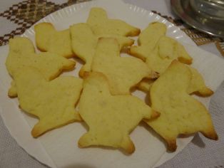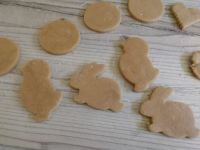 Všetko spolu zmiešame a vypracujeme cesto, ktoré necháme niekoľko hodín postáť. Potom vyvaľkáme a vykrajujeme tvary. Pečieme vo vyhriatej rúre na 170 °C asi 5 - 7 minút podľa veľkosti.