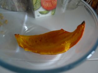 Najprv si tekvicu pripravíme na ďalšie použitie. Tekvicu otvoríme a vyčistíme od jadierok. Nakrájame na kusy. Kusy poukladáme pekáč vyložený papierom na pečenie. Pri 200°C upečieme asi 12 - 15 minút.