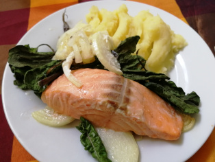 4 porcie lososa bez kože, 2 veľké cibule, 10 - 12 listov mangoldu, 50 g masla, 1 čajová lyžička morskej kryštáľovej soli