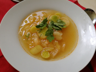 Por dáme avriť s korením a muškátovým kvetom. Vývar mierne ochutíme soľou. Z masla a múky urobíme zápražku, ktorú zalejeme vývarom a chvíľu povaríme za stáleho miešania. Odstavííme. Ešte do teplého vmiešame žĺtka tuhý sneh z bielkov a nakoniec postrúhaný syr. Misu z jénskeho skla mierne vytrieme maslom, na ktoré nasypeme mäso a na kolieska nakrájaný pór. Zalejeme horúcou zmesou. Vložíme do vyhriatej rúry na 200 °C a zapečieme asi 15 minút. Podávame s tmavým chlebom alebo varenými zemiakmi.