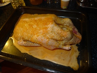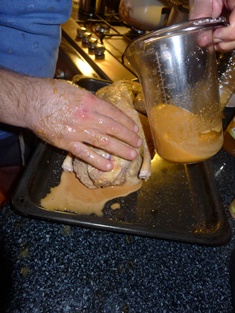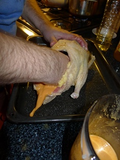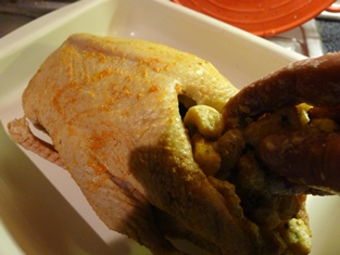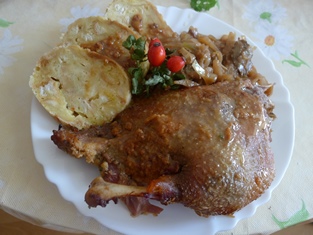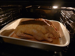 Večer pred pečením si pripravíme umytú a osušenú kačku - asi 2,5 kg. A zvnútra i z vonka ju vytrieme marinádou. Necháme ju potom prikrytú pôsobiť asi 8 hodín. Pečieme až potom.