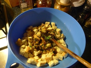 Na túto kačku sme použili 5 rožkov. Rožky nakrájame na menšie kúsky do veľkej misy. Osolíme a okoreníme mletým čiernym korením. Koľko? Po polovici čajovej lyžičky. Pridáme nasekanú petržlenovú vňať. Premiešame a pokvapkáme s asi 1 dl mlieka. Premiešame. Na masle si opražíme na drobno nakrájanú veľkú žltú cibuľu spolu s na drobno nakrájanou pečienkou. Vmiešame do plnky.