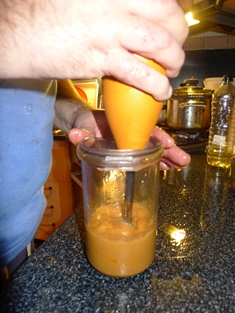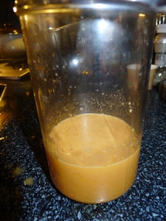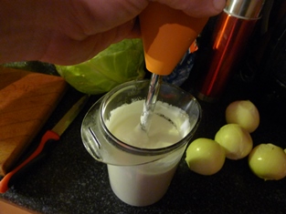 Do vyššej nádoby nalejeme 1 citrónový radler, polievkovú lyžicu medu, asi 3 veľké strúčiky cesnaku, polievkovú lyžicu soli, mokka kávovú lyžičku mletého bieleho korenia a 2 dl oleja. Vymixujeme do hladkej hmoty.