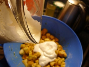 Tri veľké vajíčka si rozdelíme. Žĺtka zamiešame do plnky. Z bielok vyšľaháme sneh. A až tento sneh jemne vmiešame do zmesi. My sme mali veľmi riedku plnku - dali sme asi viac masla - tak sme museli zmes zahustiť 2-mi polievkovými lyžicami polohrubej múky.