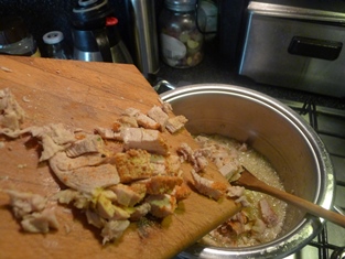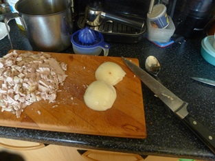 asi 500 g mäsa zo sliepky, 1 biela cibuľa, 1 žltá cibuľa, asi 50 ml vývaru, soľ, mleté čierne korenie, asi 1 polievkovú lyžicu kyslej smotany (ak môžete, môže byť aj majonéza), osminku masla